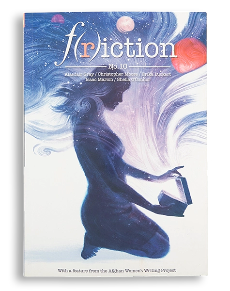 F(r)iction #10’s Pioneering Writer Feature catches up with prolific, internationally bestselling humorist Christopher Moore, combining interview, field notes, and an excerpt of his novel-in-progress Midsummer. Our Debut Author, ghostwriter-turned-thriller-writer Aimee Molloy, talks plot and shop about The Perfect Mother and its film adaptation with Kerry Washington. For poetry, look no further than the lyricisms of Alasdair Gray, Erika Luckert, and Sheila O’Connor. For comics, clutch your scarf close for Jonas Goonface’s chilling “Snow Brigade.” We are also honored to posthumously publish Naira Kuzmich’s “Memory, Longhand,” an essay grappling with language and belonging, as well as to feature highlights from the Afghan Women’s Writing Project, a collective fighting to tell their stories in a world that has denied them education and voice.