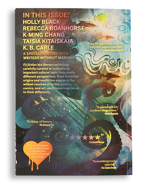 Join us for our Pioneering Writer Feature with the Nebula, Hugo, and Locus Award-winning speculative fiction author Rebecca Roanhorse, who brings us a truly stunning graphic short about finding one’s meaning among the stars. Dig into K-Ming Chang’s tale “Divination” about looking into the future and Charlie Claire Burgess’s tarot-infused creative nonfiction “Fools and Believers.” For poetry, relish the vibrant language and divine diction of “Toward Light,” our Community Feature with Writers Without Margins, and a suite of poetry by Taisia Kitaiskaia. And there’s even a cheeky otherworldly quiz by Holly Black to kick the issue off.