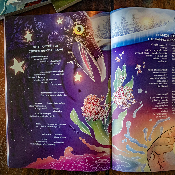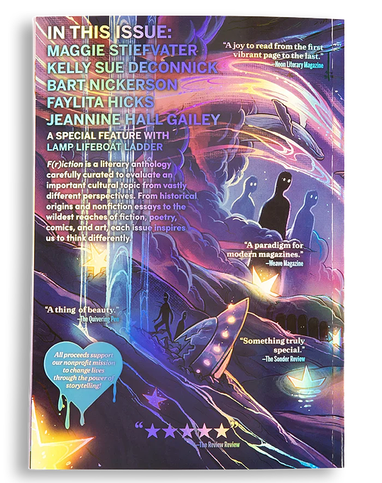 Plus, we have a brilliant short story from Maggie Stiefvater in the The Raven Cycle world, a fantastical romantic murder fiction by Bart Nickerson (Yellowjackets, Narcos), phenomenal poetry by Faylita Hicks and Jeannine Hall Gailey, and a comic about chasing (and seizing) your dreams by the legendary Kelly Sue DeConnick. There’s even a gorgeous special feature created in partnership with Lamp Lifeboat Ladder.