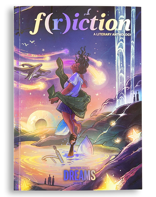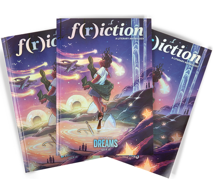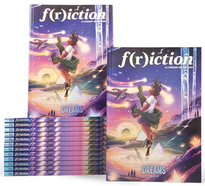 Whatever your dreams, hallucinations, or fantasies… Whatever your restless visions and twilight terrors, the 22nd issue of F(r)iction is sure to entrance, dazzle, and leave you wondering if what you’ve just read was a work of fiction or some divine missive projected from the mind’s eye of an always slumbering architect…