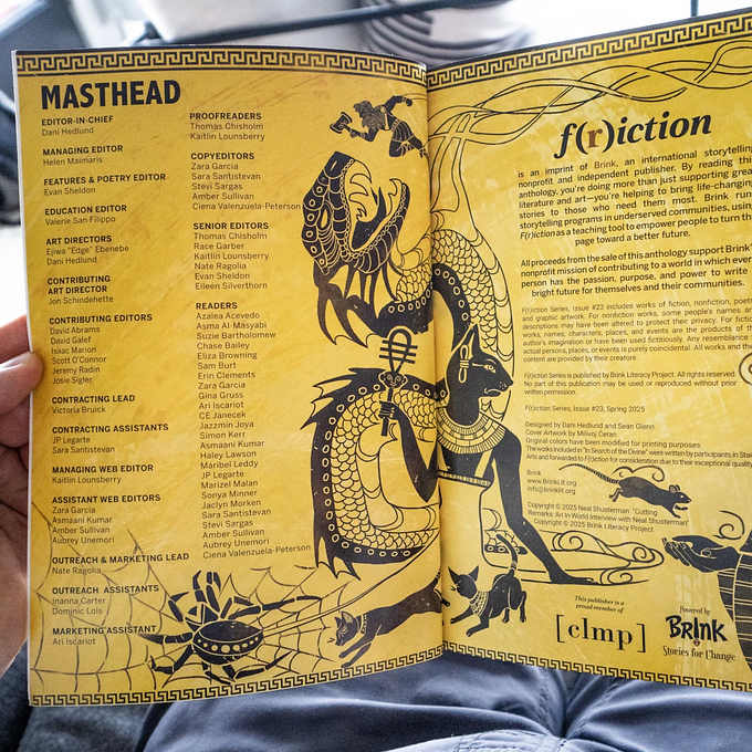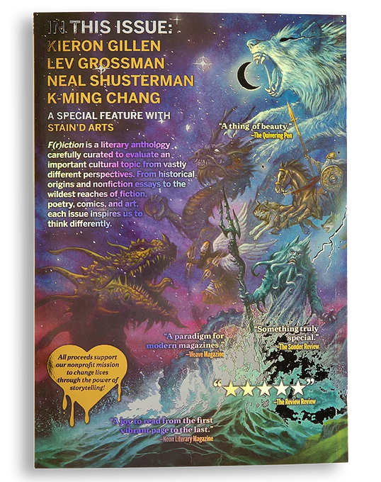 In these pages, K-Ming Chang teaches us about forgotten gods, what they represented and where they’ve gone. You’ll join a literal goddess on a series of bad dates and witness a worker who helps the dead resolve their last business on Earth. We’ve got a story of a man of faith confronting death and questioning God, and even some heartfelt creative nonfiction about accepting one’s imperfections in the face of godly perfection. Plus, our Gods issue features a can’t-miss comic by Kieron Gillen (The Wicked + The Divine, Immortal X-Men, and Once & Future), an interview with Lev Grossman (The Magicians, The Bright Sword), a Community Feature with Stain’d Arts, and a very special comic from a justice-impacted student in our Frames Comic Education Program!