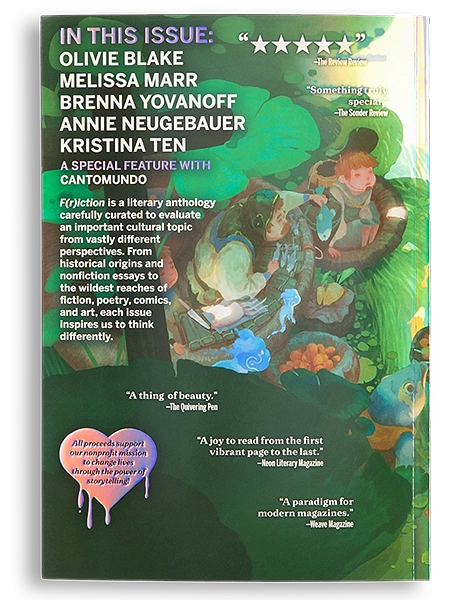 In these pages, best-selling The Atlas Six trilogy author Olivie Blake crafts a social media influencer's fairytale, Wicked Lovely writer Melissa Marr invites us to the court of a monarch mouser, and fantasy-author Brenna Yovanoff takes us to the macabre Midnight Market. F(r)iction #25: Fairytales also features a Rashomon-style take on Snow White, a stunning suite of poems about Mamă Pădurii, a haunting exploration of Humpty Dumpty, and a new student comic memoir from Frames Comic Program alum, Eric Boylan. Plus, a community feature with CantoMundo, and so much more!