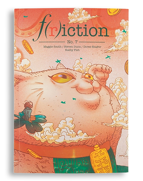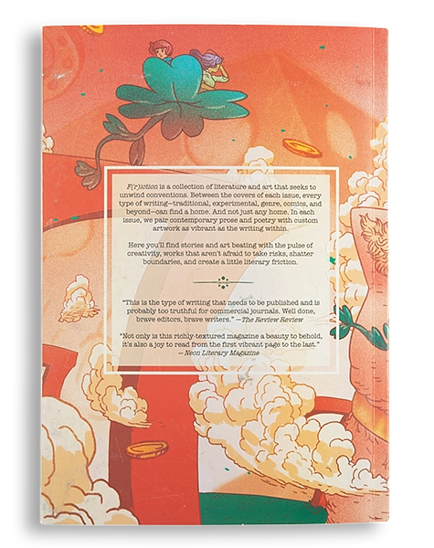 We won’t deny it—picking up this issue is a gamble, a game-show wheel of stories, nonfiction, and poetry. Cursed clock towers? School bus psychics? Angel organs? The only thing you can expect from F(r)iction #7 is the thrill of the unexpected. The heart of this magazine has always beat with the pulse of creativity and risk. After all, what some call “fiscally irresponsible nonsense” is our MO: breaking away from boring page designs and cliché themes and taking a chance on stories that hum with literary friction.