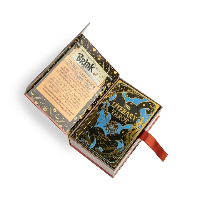 Each card is adorned with gold foil and prismatic foil accents. And the box set comes in a gorgeous magnetic closing book-themed box that includes all 78 cards and a mini guidebook with upright and reversed card reading descriptions in the style of the chosen classic story!