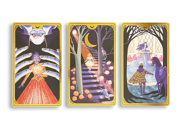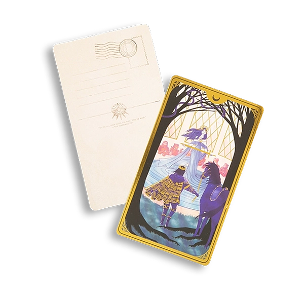 | Contents | 3 postcards featuring artwork from The Literary Tarot deck, 400gsm card stock, gold-foiled designs, rounded corners, gilded edges, reverse side is parchment-colored |